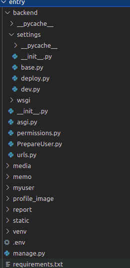 entry 디렉토리에는 django framework 파일과 디렉토리가 저장되어 있다.