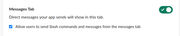 App Home 에 들어가서 Message Tab 아래에 있는 Allow~~ 를 클릭해주자