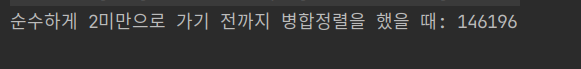 근데 일정 갯수가 커지니깐 순수하게 병합정렬한 시간이 더 짧은 것을 볼 수가 있다. 음....