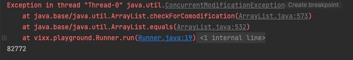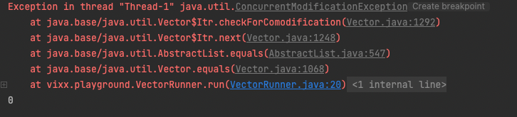 Vector의 경우에는 AbstractList에 있는 equals에서 next()하는 부분에서 에러가 났는데 Vector 안에 Itr라는 iterator를 상속해서 구현한 클래스에서 next 하는 부분에 checkForComodification이 있는데 이 부분에서 에러가 난 것이다.