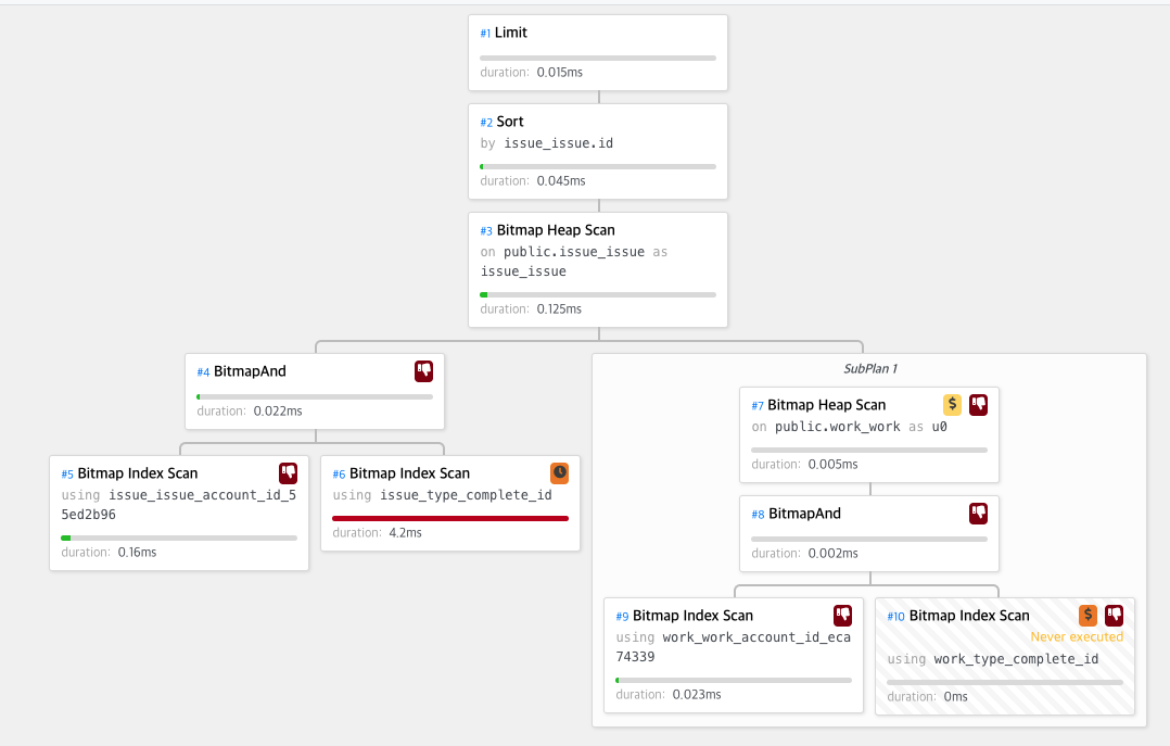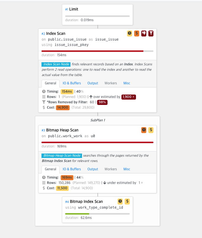 이제 특정 유저에 대한 이슈에서 4번 모델 타입의 워크를 제외한 것 중 2,3,4 인 모델 타입인 이슈에 대한 것 중 아이디가 가장 작은 것을 찾을 때 어떤게 빠를 지 보자