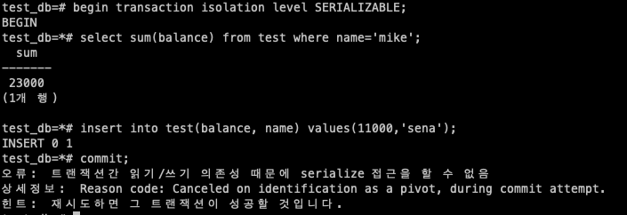 그 이유는 하나의 트랜잭션을 기준으로 전과 후의 값이 달라지기 때문에 직렬화 이상으로 에러 메세지를 내보내게 된다.