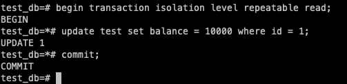 반복적 읽기 고립 수준은 트랜잭션 BEGIN 이 전의 커밋 내용들만 볼 수 있습니다. 해당 트랜잭션이 진행 중일 때는 커밋되지 않은 내용이나 커밋된 내용은 볼 수 없습니다. (하지만 같은 트랜잭션 내에서 업데이트 이후에 조회를 했을 때는 업데이트 된 내용을 볼 수 있습니다.)