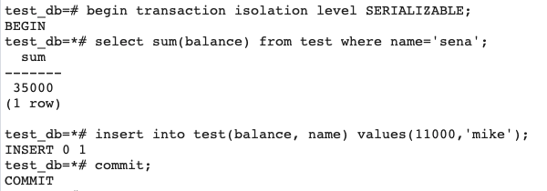 - 첫 번째 트랜잭션은 'sena'이름으로 된 잔액의 총합을 구하고 'mike'라는 이름을 가진 row를 생성하고 commit 하는 상황