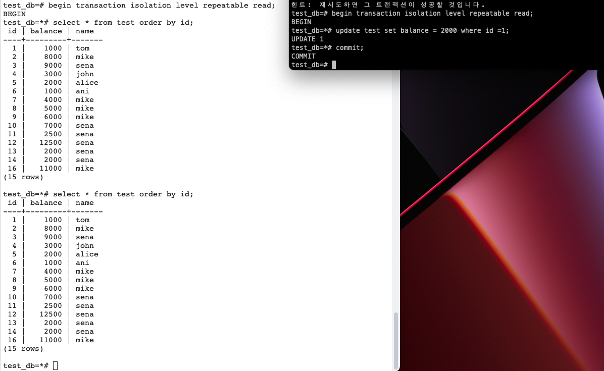 - 두 번째 트랜잭션에서는 조회를 반복적으로 진행했다.