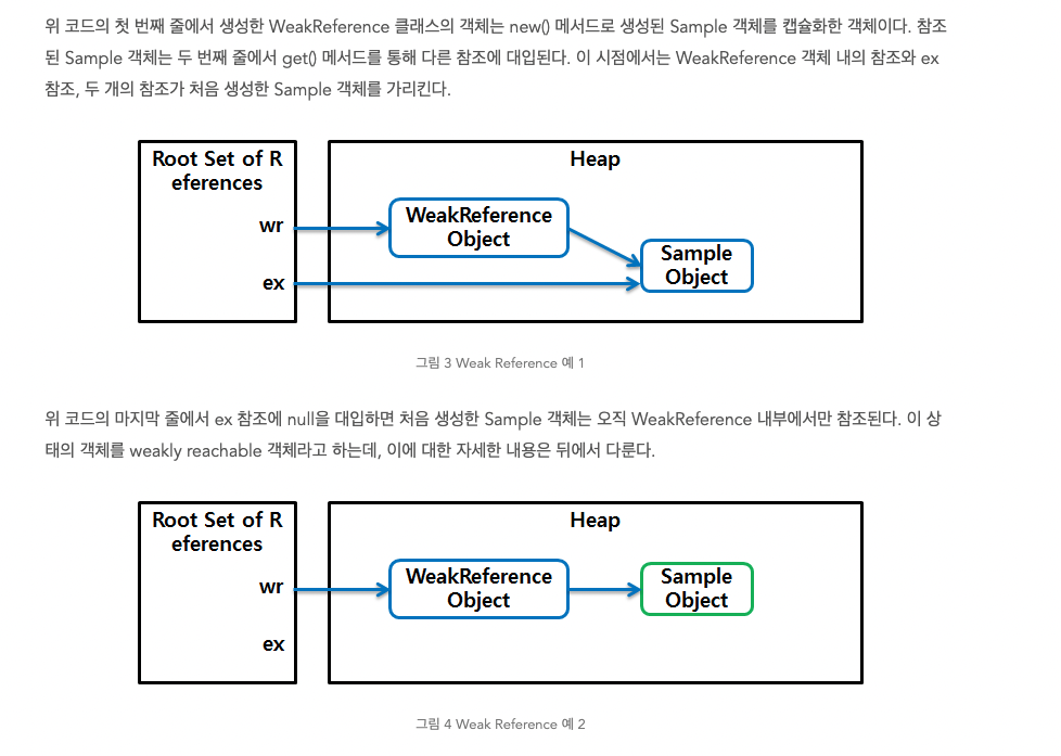 LRU 캐시와 같은 애플리케이션에서는 softly reachable 객체보다는 weakly reachable 객체가 유리하므로 LRU 캐시를 구현할 때에는 대체로 WeakReference를 사용한다