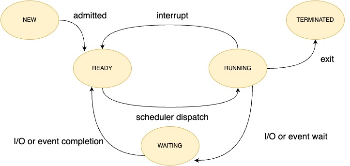 프로세스는 '실행 중인 프로그램'이며, 위와 같은 생명 주기를 갖는다. 즉, 생성(new) 이후 종료(terminated) 전까지 준비(ready)와 실행(running)과 대기(waiting) 상태를 반복한다. 실행 중인 프로세서는 interrupt에 의해 수시로 실행 준비 상태(Running Queue)로 전환했다가 다시 실행 상태로 전환한다. 여러 프로세스가 하나의 CPU를 공유할 수 있지만, 특정 순간에는 하나의 프로세스만 CPU를 사용할 수 있기 때문에 이런 메커니즘이 필요하다.