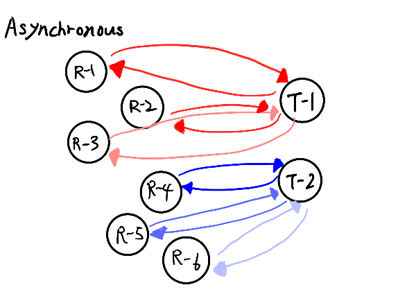 asynchrous 방식은 thread-per-style 과 같이 하나의 스레드로 처음부터 끝까지 하는 것에 비해, fine-grained sharing of threads(스레드의 세분화된 공유)는 오직 수행할 때에만 스레드를 수행하며, 이러한 방식은 많은 스레드 사용 없이 많은 수의 요청건을 처리한다. OS Thread 부족함으로 인한 처리량의 제한은 제거되지만, 비용은 비싸다. 왜냐하면 흔히 아는 asynchronous style을 알아야 한다. 이 말은 람다 표현식, 순차적 파이프 형식을 구성해야 한다.